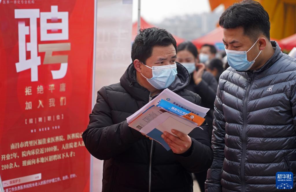 2月25日,江西省南昌市灣里管理局開展“春風行動”線下招聘活動。這是求職者在招聘會現場交流。新華社記者 萬象 攝