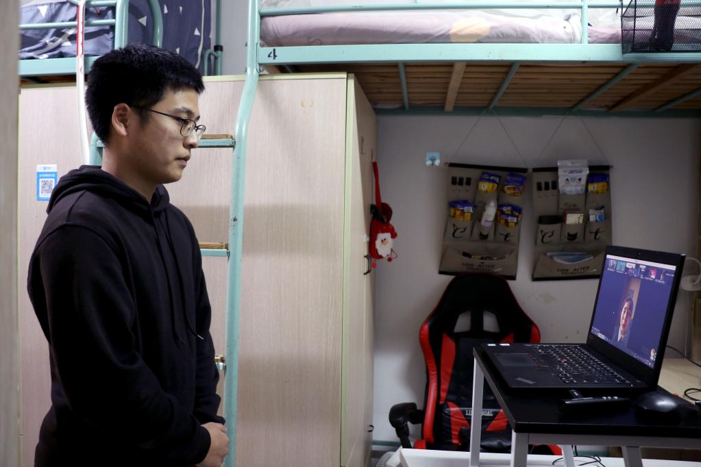圖為3月30日,上海海洋大學2022屆畢業生在宿舍內參加線上面試。新華社發
