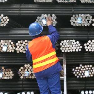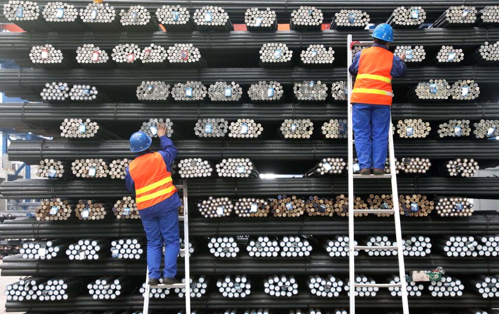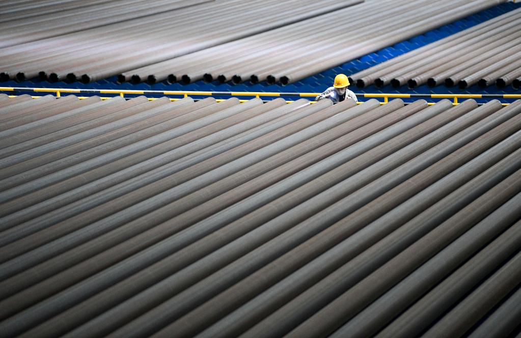 2022年4月19日,在位于承德市營子區的承德建龍特殊鋼有限公司無縫鋼管廠,工人檢查無縫鋼管品質。新華社發(王立群 攝)