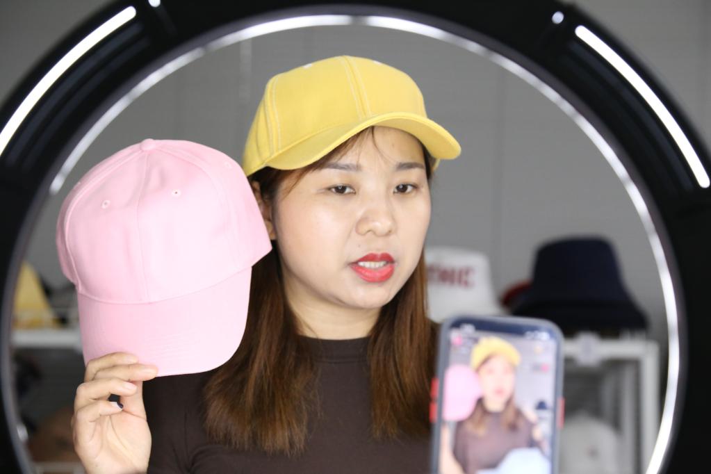 河南淮陽瑞能服帽直播帶貨間。(新華社發)