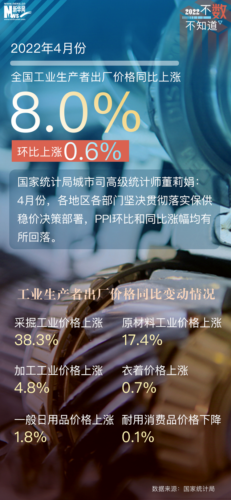 從全國工業生產者出廠價格指數(PPI)看,盡管國際大宗商品價格高位運行,但各地區各部門貫徹落實保供穩價決策部署,4月份PPI同比上漲8%,漲幅比上月回落0.3個百分點。