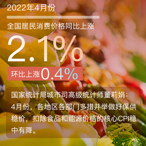 “4月份,在國際通脹水平居高不下的背景下,國內民生商品和大宗商品保供穩價效果持續顯現,物價總水平繼續運行在合理區間?!敝袊暧^經濟研究院綜合形勢研究室主任郭麗巖說。