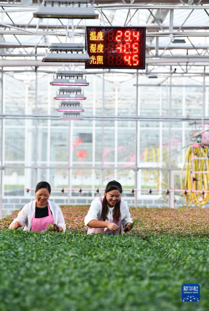 農民在位于貴州省威寧縣的貴州江楠育苗中心管理蔬菜苗,大棚內的溫度、濕度、光照可通過人工智能系統調控(2020年6月16日攝)。新華社記者 楊文斌 攝
