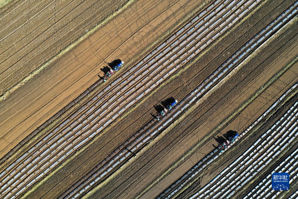 在貴州省威寧縣雙龍鎮涼山社區的眾果農機社會化服務基地,農民駕駛馬鈴薯自動播種機在播種(3月8日攝,無人機照片)。新華社記者 楊文斌 攝