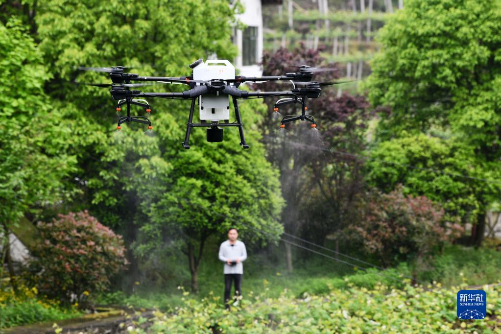 在貴州省貴陽市息烽縣小寨壩鎮紅巖村,農技人員在葡萄基地進行無人機植保作業(2021年4月17日攝)。新華社記者 楊文斌 攝