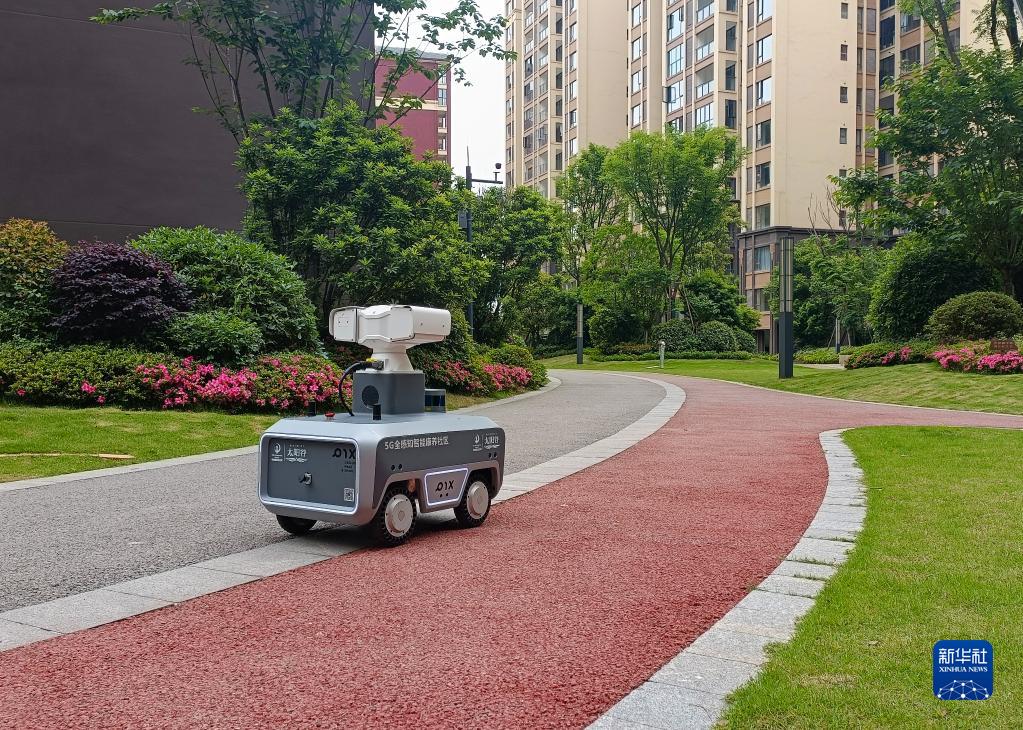 貴州省龍里縣中鐵國際生態城太陽谷5G全感知智能康養社區內的無人駕駛安防車在運行中(5月23日攝)。新華社記者 劉續 攝
