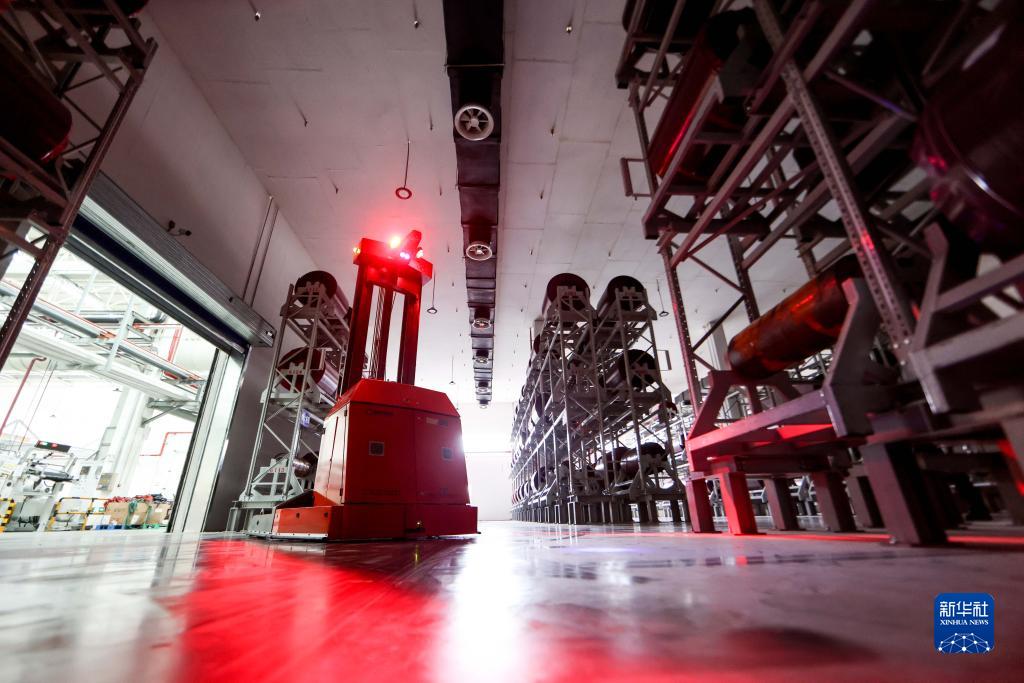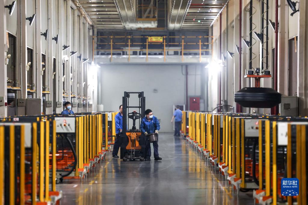 AGV無人搬運小車在貴州輪胎股份有限公司“5G全連接工廠”的部件生產區內工作 (5月17日攝)。新華社記者 歐東衢 攝