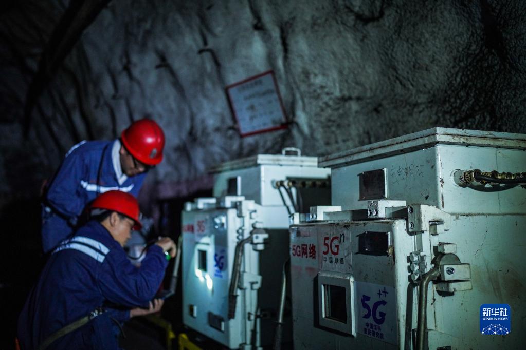 貴州盤江精煤股份有限公司山腳樹礦工作人員在井下檢查5G基站控制器運行情況(5月18日攝)。新華社記者 陶亮 攝
