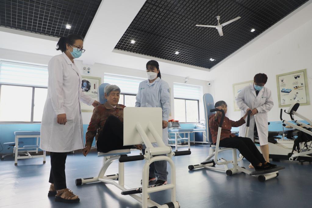 5月27日,在山東省博興縣呂藝鎮老年公寓醫養康復中心,醫護人員指導農村老人利用專業器械進行康復鍛煉。(博興縣委宣傳部供圖)