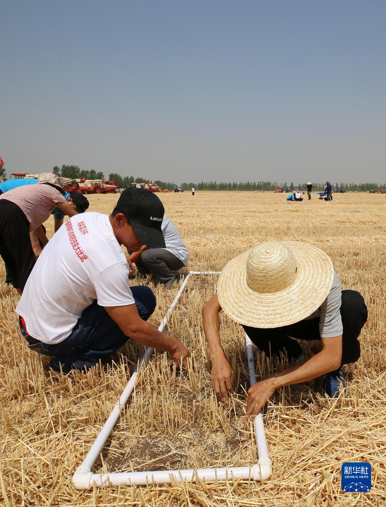 6月2日,在山東省臨沂市郯城縣郯城街道,裁判組工作人員在框取的測評區域之內撿拾麥粒,測算減損率。新華社發(張春雷攝)