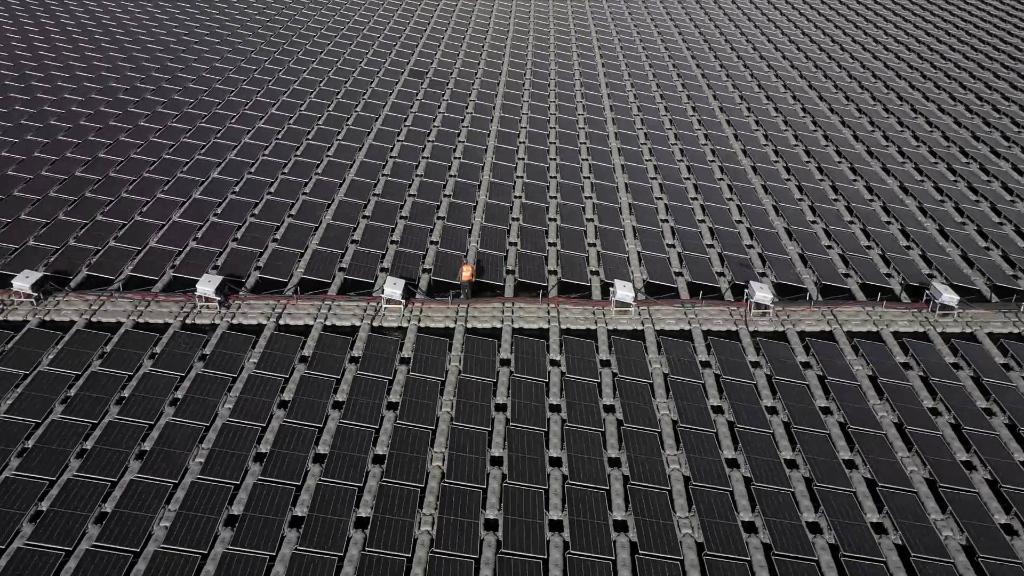 國家能源集團寧夏電力寧東電廠3×5.98兆瓦漂浮分布式光伏發電項目位于寧夏靈武市馬家灘鎮毛烏素沙地邊緣,這里氣候干旱少雨,煤炭資源豐富,煤炭開采中排出的礦井水形成了大大小小的湖泊。