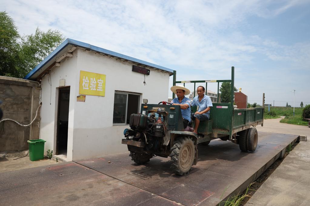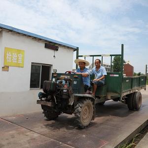 吳鋒高(左)與江新華將收到的稻谷運到米廠稱重并接受食品安全檢測。新華社記者 薛宇舸攝