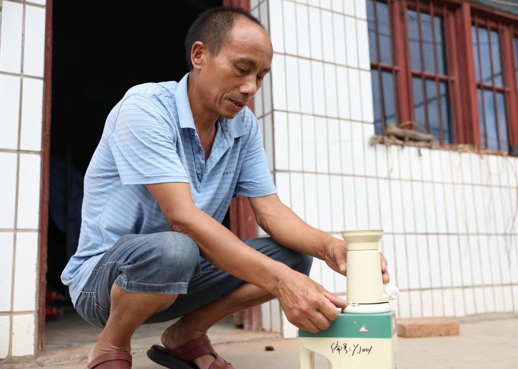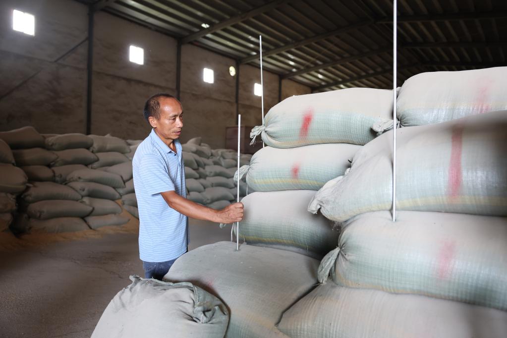 江新華正在使用測溫儀測量稻谷溫度。新華社記者 薛宇舸攝