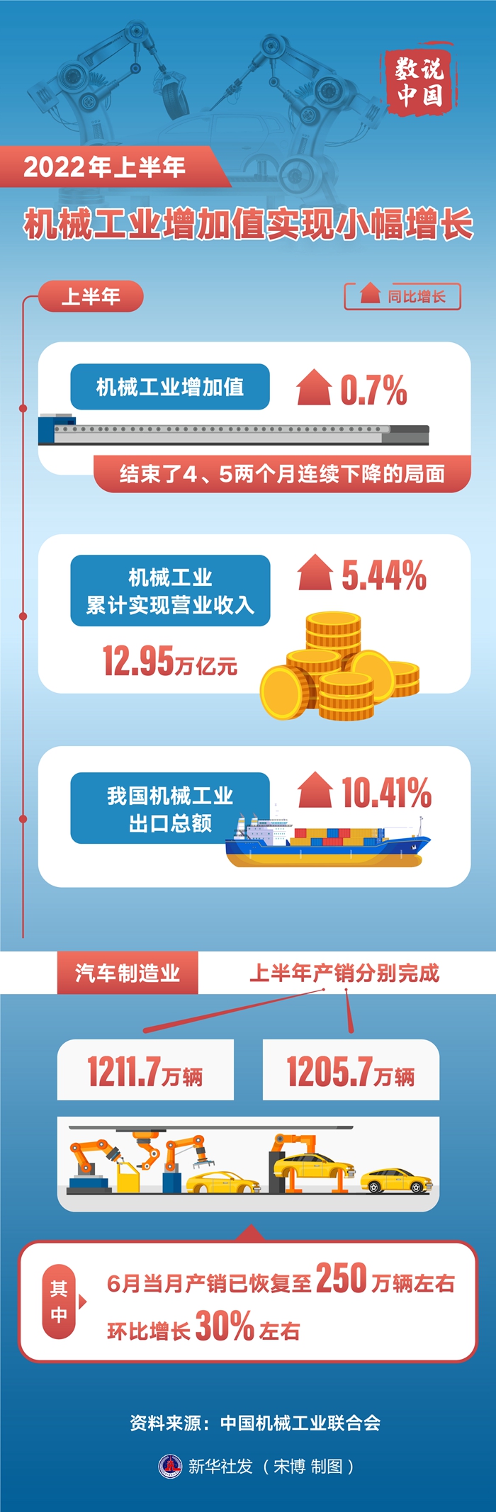 新華社北京8月9日電(記者張辛欣)記者9日從中國機械工業聯合會獲悉,上半年機械工業增加值同比增長0.7%,結束了4、5兩個月連續下降的局面。其中,汽車制造業快速擺脫疫情影響,上半年產銷分別完成1211.7萬輛和1205.7萬輛。