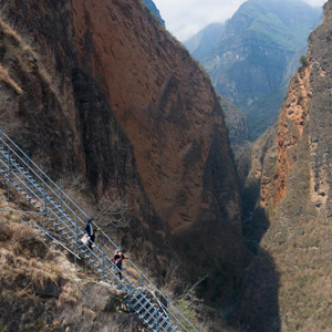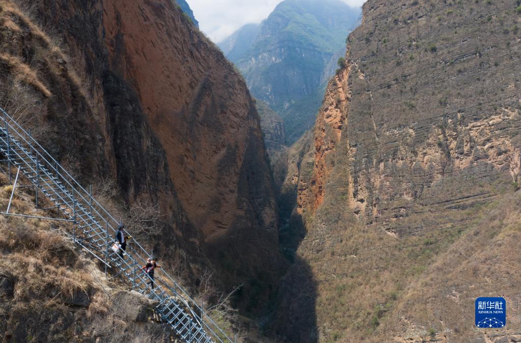 2020年5月13日,四川省涼山彝族自治州昭覺縣支爾莫鄉“懸崖村”——阿土列爾村高山區的貧困戶沿著鋼梯下山,準備搬進昭覺縣城易地扶貧搬遷安置點的新家(無人機照片)。新華社記者 江宏景 攝