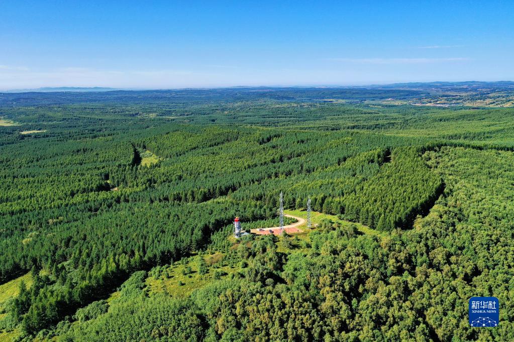 這是2021年8月23日拍攝的河北塞罕壩機械林場內的望海樓(無人機照片)。三代塞罕壩林場人50多年堅持植樹造林,用汗水澆灌出綠波涌動的百萬畝人工林海。新華社記者 牟宇 攝