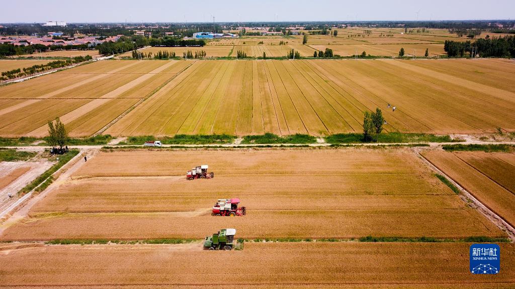 2022年6月7日,在山東省惠民縣桑落墅鎮,農民駕駛農機收獲小麥(無人機照片)。新華社記者 郭緒雷 攝