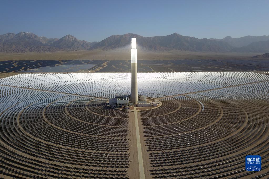 這是2022年6月8日在海西蒙古族藏族自治州德令哈市光伏(光熱)產業園拍攝的青海中控德令哈50兆瓦光熱電站(無人機照片)。新華社記者 范培珅 攝