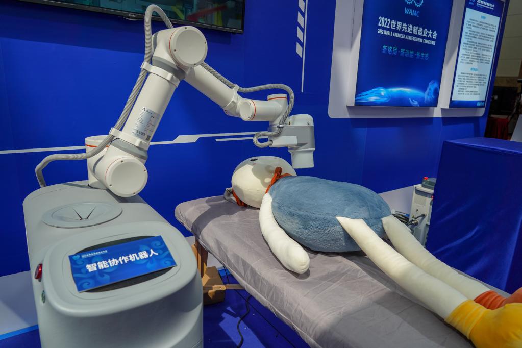 圖為紐氏達特機器人系統技術有限公司在2022世界先進制造業大會上展示的智能協作機器人正在模擬艾灸。新華社記者朱崢 攝