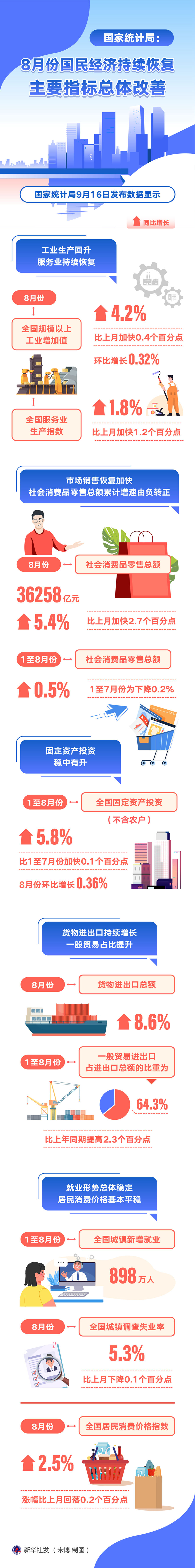 國家統計局16日發布數據顯示,8月份,國民經濟延續恢復發展態勢,生產需求穩中有升,就業物價總體穩定,多數指標好于上月,但恢復基礎仍需鞏固。