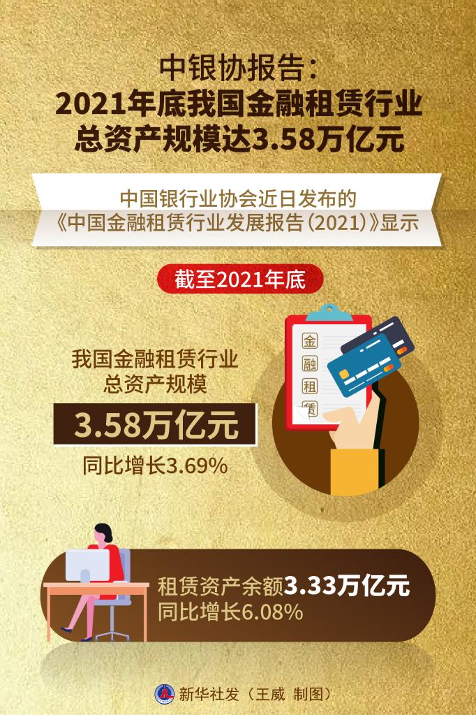 中國銀行業協會近日發布的報告顯示,截至2021年底,我國金融租賃行業總資產規模為3.58萬億元,同比增長3.69%;租賃資產余額3.33萬億元,同比增長6.08%。新華社發 王威 制圖