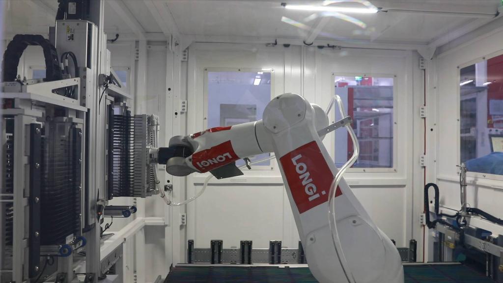 西安隆基樂葉是光伏企業隆基綠能科技股份有限公司位于西安的單晶硅太陽能電池生產廠。生產車間,隨處可見的機器人“搬運工”將物料送到指定地點;操作間里,伴隨機械手臂的起落,硅片的鍍膜順利完成……從制絨到鍍膜、再到印刷燒結,每一道工序都有條不紊。
