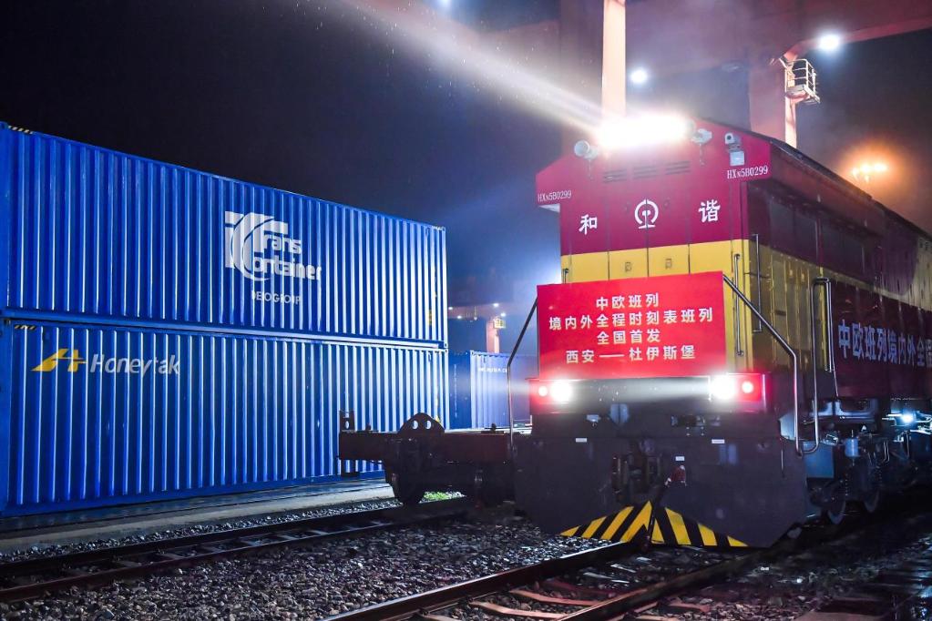 夜色中開行的中歐班列長安號。(西安國際陸港多式聯運有限公司供圖)