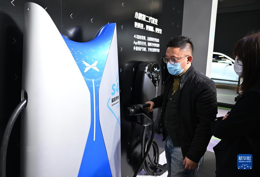 在第二十屆廣州車展的小鵬汽車展臺,參觀者體驗S4超快充樁(2022年12月30日攝)。新華社記者 鄧華 攝