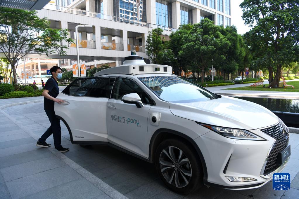 在深圳前海,一名乘客體驗乘坐小馬智行自動駕駛汽車(2022年8月1日攝)。新華社記者 梁旭 攝