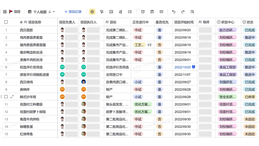 “莜面魚魚”“莜面村三種蘑菇”“胡蘿卜燜飯”……只見數百個產品研發項目在多維表格里清晰排列,項目負責人、完成進度、優先級一目了然。