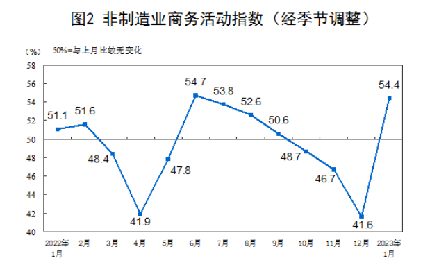 1月份,非制造業商務活動指數為54.4%,比上月上升12.8個百分點,重返擴張區間,非制造業景氣水平觸底回升。