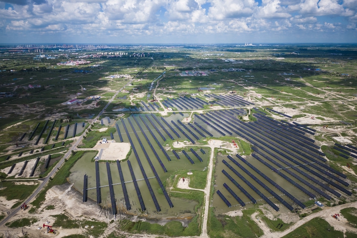 圖為2022年7月21日拍攝的大慶油田星火水面光伏項目(無人機照片)。新華社記者張濤 攝