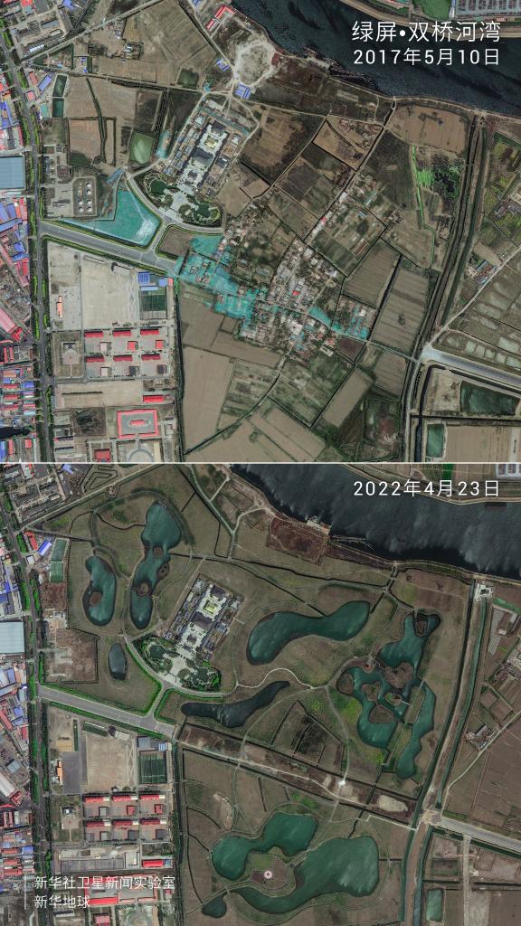 衛星拍攝的綠屏·雙橋河灣對比圖。
