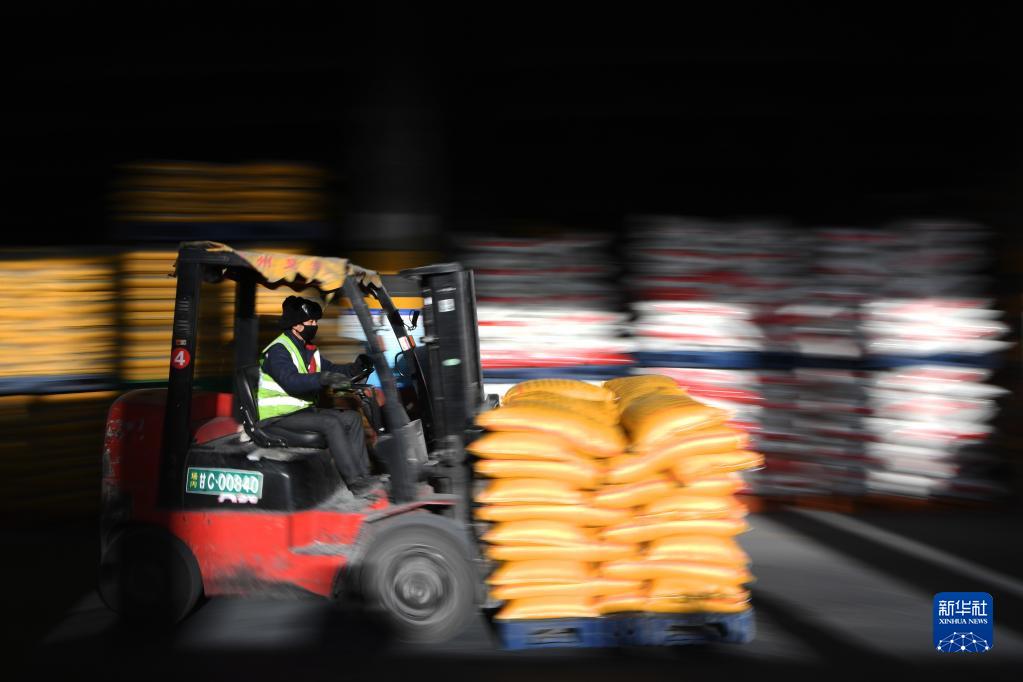 2月17日,在甘肅省金昌市一企業鐵路專用線上,工作人員駕駛叉車準備將化肥裝車。