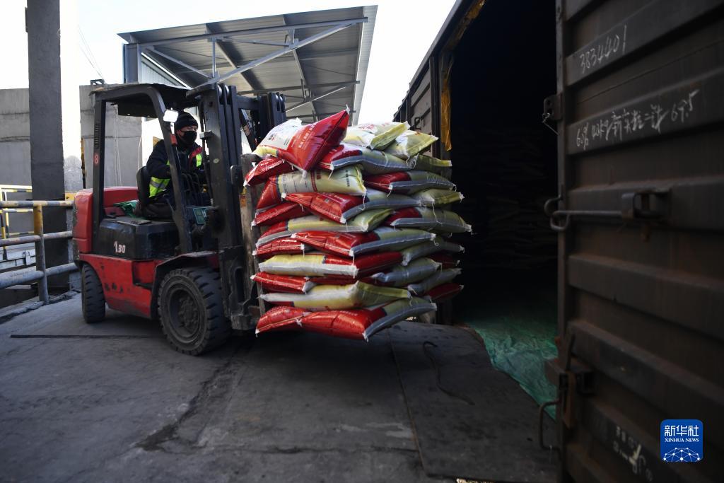 2月17日,在甘肅省金昌市一企業鐵路專用線上,工作人員駕駛叉車將化肥裝車。