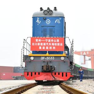 2月8日,在常州站鐵路貨場,裝載新能源汽車的海鐵聯運鐵路班列即將發車。新華社發(史康 攝)