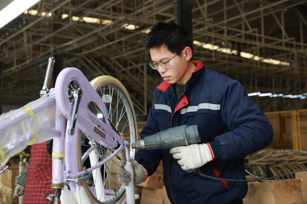 萬怡自行車廣宗有限公司車間里,工人正在組裝自行車。新華社記者齊雷杰 攝