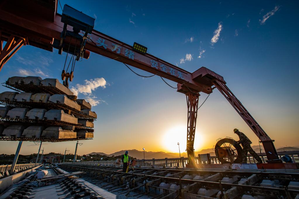 工人在新建福(州)廈(門)鐵路湄洲灣跨海大橋施工(2022年4月8日攝)。(新華社記者周義攝)
