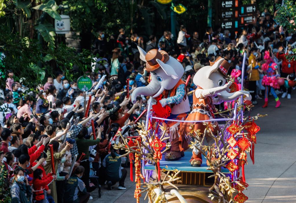 2023年1月22日,游客在廣州長隆野生動物世界觀看新年花車巡游。(新華社記者劉大偉攝)