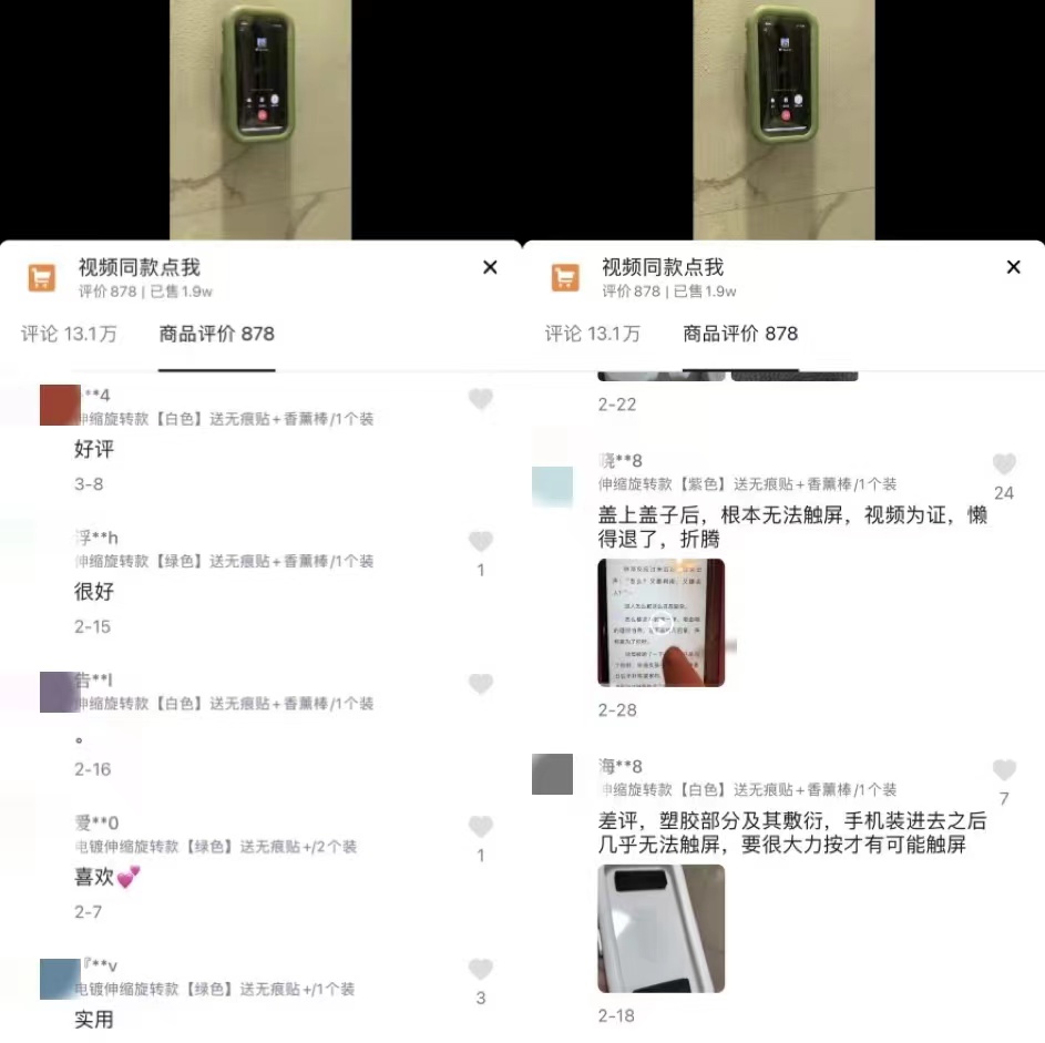 圖為某短視頻平臺銷售的防水支架,前期大量“好評”引流,真實評價不佳。