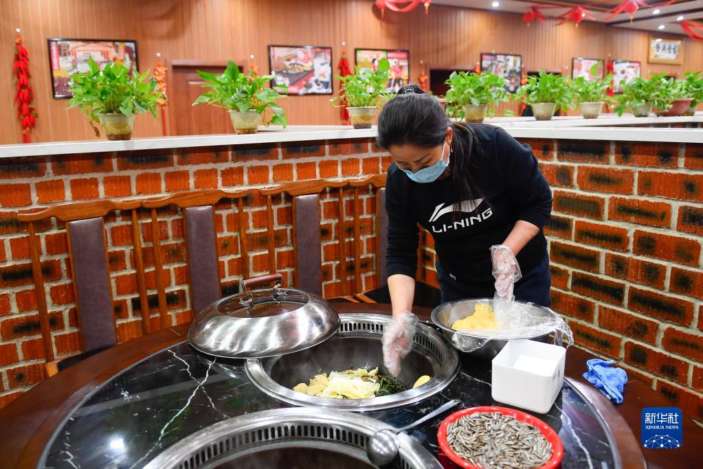 在吉林省吉林市永吉縣北大湖鎮南溝村,一家農家樂的經營者為客人準備菜品(2022年11月21日攝)。新華社記者 許暢 攝