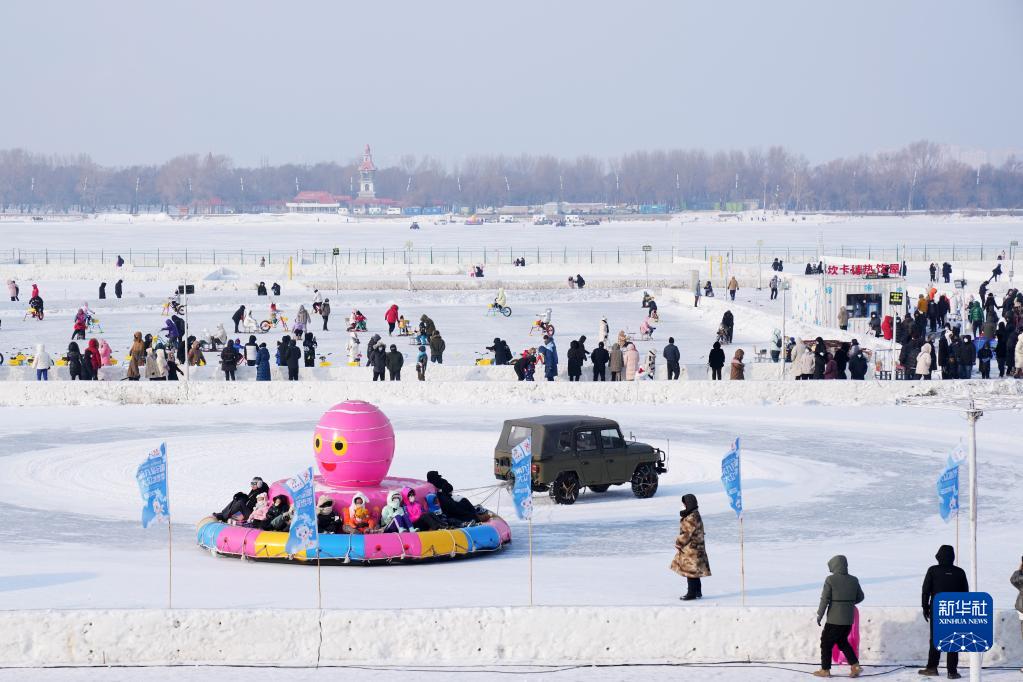 在黑龍江省哈爾濱松花江冰雪嘉年華園區,游客在體驗冰雪娛樂項目(1月22日攝)。新華社記者 王建威 攝
