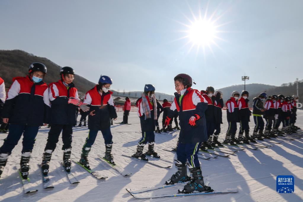 在吉林省吉林市萬科松花湖度假區,吉化第九中學學生在滑雪體育課上練習(2月27日攝)。新華社記者 許暢 攝