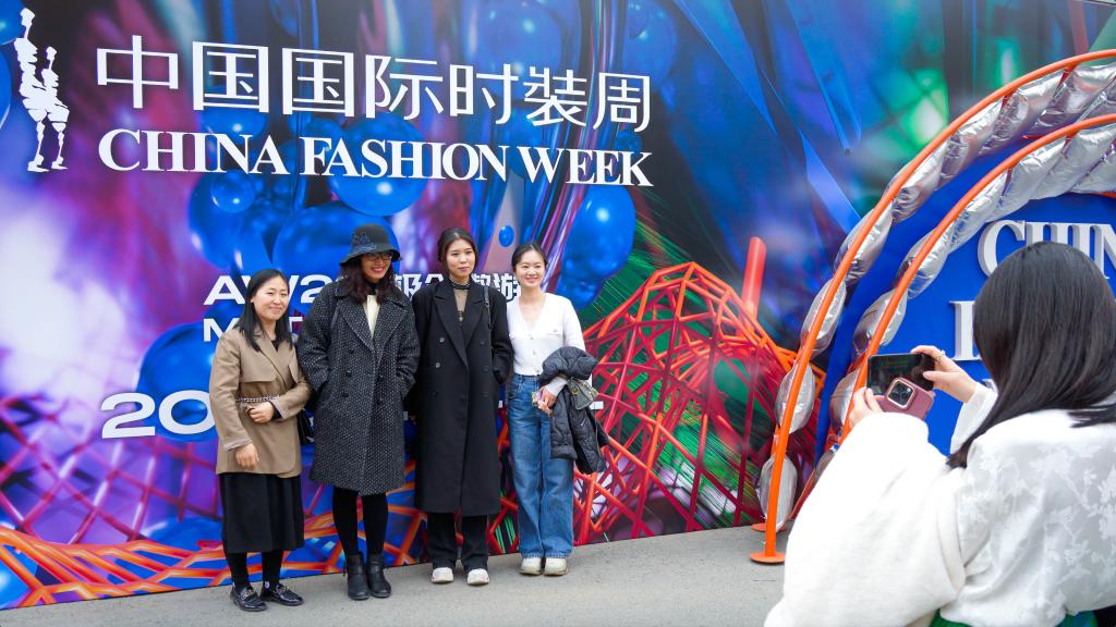 3月24日,觀眾在2023秋冬中國國際時裝周展板前拍照留念。新華社記者魏弘毅 攝
