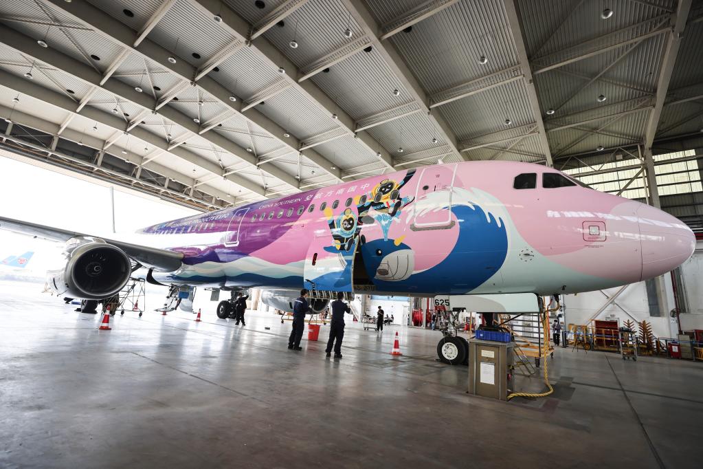 2023年3月7日,在??诿捞m國際機場,南航機務人員對“消博號”彩繪飛機進行深度檢查。新華社記者 張麗蕓 攝