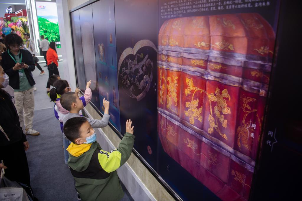 甘肅館“我在敦煌畫壁畫”數字虛擬體驗活動現場圍滿了小朋友。5歲的張孟石在電子屏上選擇壁畫線稿,用朱紅、佛手黃、落英淡粉等巖彩進行填充。瞬間,一幅《雙鴿紋》壁畫便從遙遠的莫高窟“走”出來,躍上電子屏“活”了起來?!暗谝淮螄L試‘畫’壁畫,覺得很好看、很好玩!更想去敦煌莫高窟旅游了?!睆埫鲜癫娠w揚地說。