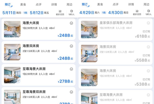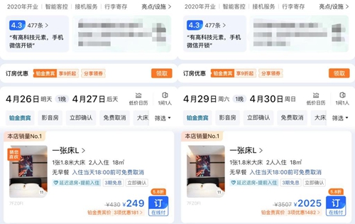 西安熱門旅游景區大雁塔旁的一家精品酒店,18平方米的大床房平日價249元,4月29日、4月30日和5月1日入住的價格均高達2025元,幾乎在平日價后面直接加了個零。有受訪者表示,四位數住這樣的酒店,實在無法接受。專家建議,節假日酒店房價上漲雖然受市場供需影響,但也需要考慮漲價幅度的合理性,劇烈的酒店價格波動不利于維護市場的良好秩序。