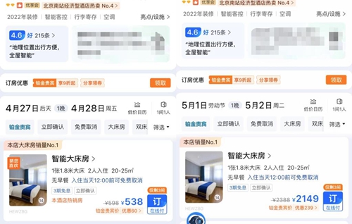 而這一輪漲價潮中,經濟型酒店的房價漲幅尤其突出。位于北京珠市口地鐵站旁的一家經濟型酒店,智能大床房平日售價在500元左右,4月29日入住為1699元,5月1日則漲到2149元。