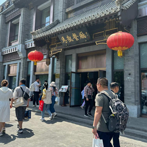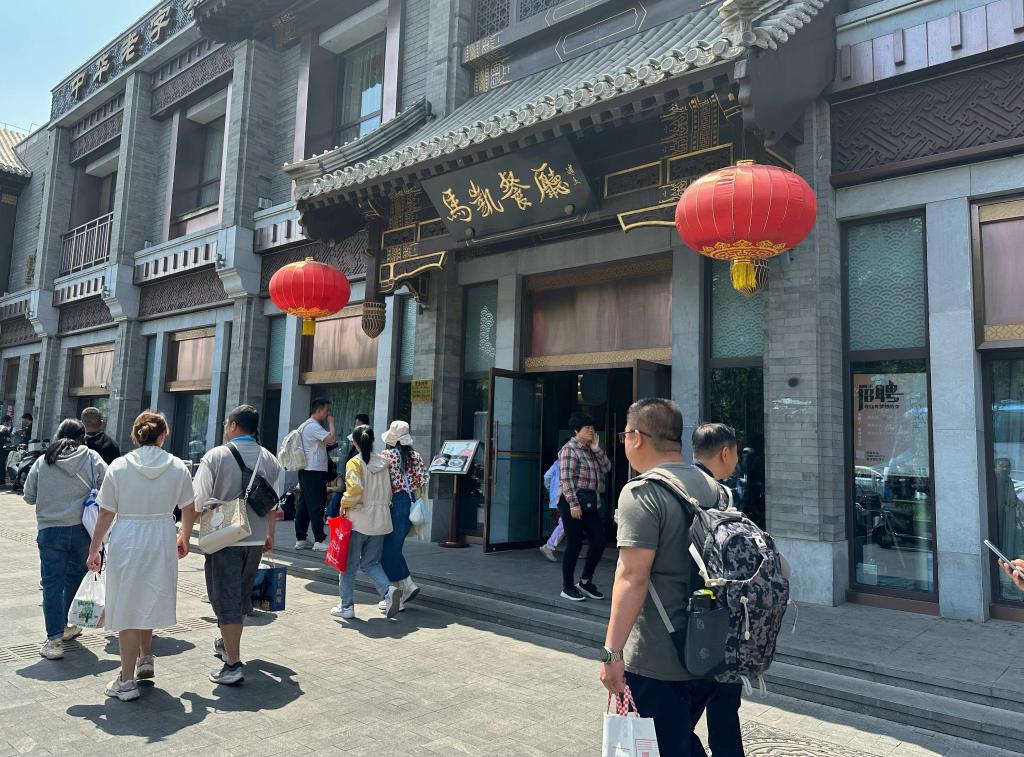 上午10點半,地安門外大街上已是人流熙攘,鼓樓紅墻前不少游客在拍照“打卡”,煙袋斜街內不時傳來歡聲笑語。馬凱餐廳外大紅燈籠隨風搖曳,中午開餐時間剛過,就有顧客陸續進入。