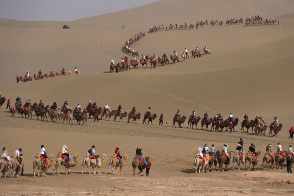 “2400多峰駱駝全部‘上崗’,從早到晚忙不過來!原本40分鐘的路程現在要走1小時左右?!倍鼗网Q沙山月牙泉景區負責人說。